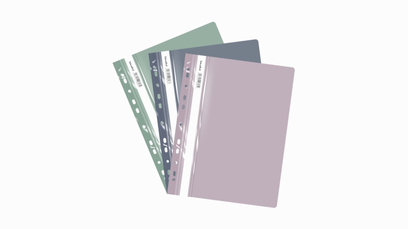 Skoroszyt wyposażony jest w wymienny, papierowy pasek do opisu, który ułatwia identyfikację zawartości. Dwa wycięcia umożliwiają szybkie i łatwe wysuwanie paska, co dodatkowo poprawia funkcjonalność. Zaokrąglone rogi obu okładek zwiększają komfort użytkowania i zapobiegają uszkodzeniom innych dokumentów.