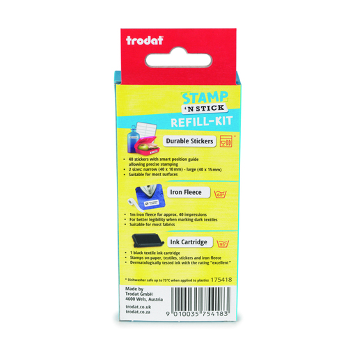 zawiera: pieczątkę, komplet liter, cyfr i ikonek, pozwalających na układanie i zmianę własnego tekstu w każdym momencie, czarną wkładkę tuszującą, taśmę do naprasowywania na ciemnych tkaninach oraz 30 etykiet do naklejania na przedmiotach innych niż z tkanin